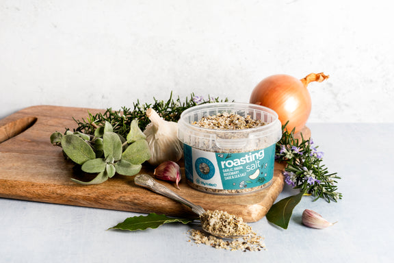 Our Roasting Salt is the perfect mix of garlic, onion, rosemary and sage, blended with Cornish Sea Salt to create a moreish savoury seasoning. Try it sprinkled on roast chicken for a crisp and savoury skin and on baked fish.